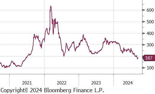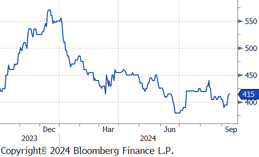 Copper futures rose by $16.25 or 4.0% to $424, similarly buoyed by a weaker dollar and expectations of a US Federal Reserve interest rate cut this week. A weaker dollar makes metals more affordable for investors holding other currencies. A rate cut could stimulate economic growth, boost demand for metals, and put additional pressure on the dollar. However, recent data from China shows weaker-than-expected industrial output, retail sales, and fixed asset investments for August, raising concerns about demand from the world’s largest metal consumer. Additionally, China’s urban unemployment has reached a six-month high, and home prices are falling at their fastest rate in nine years.