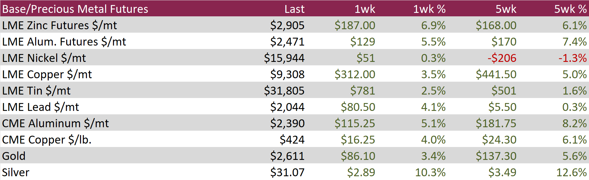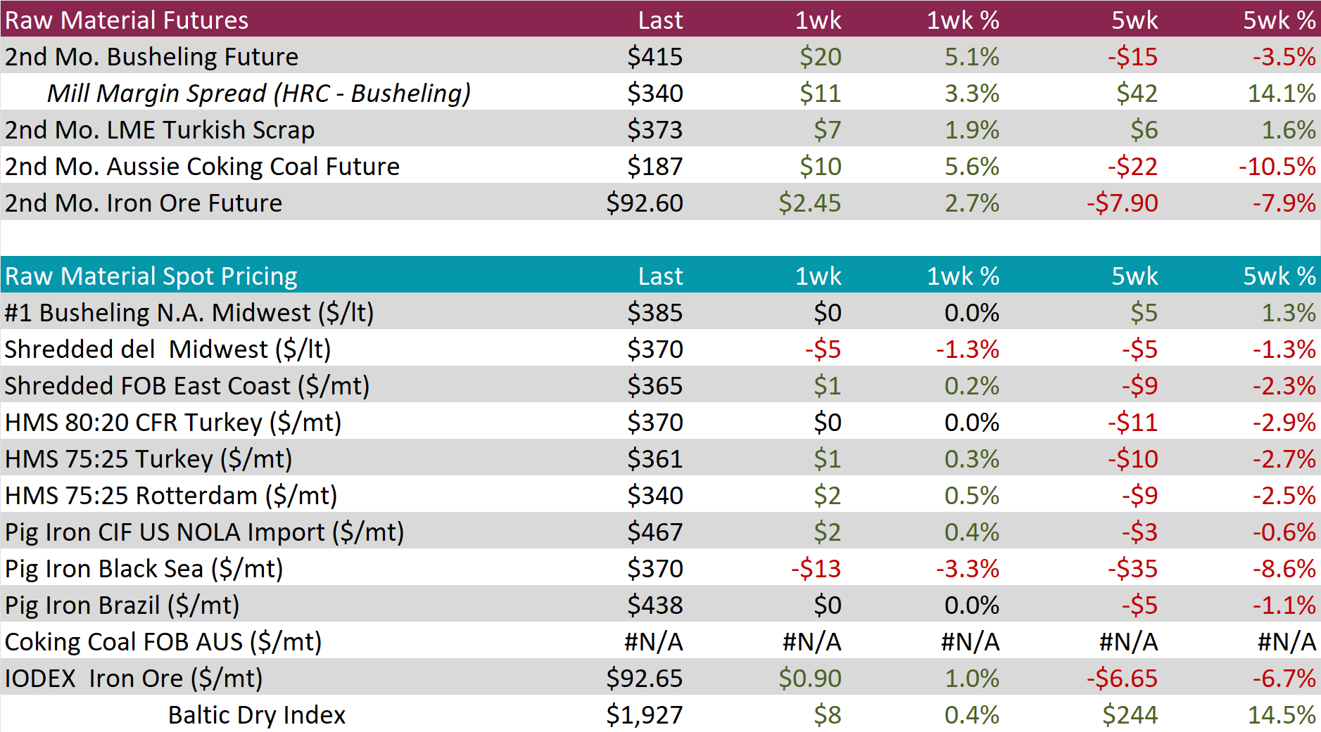 The busheling 2nd month future rose by $20 or 5.1% to $415, rebounding from last weeks drop.