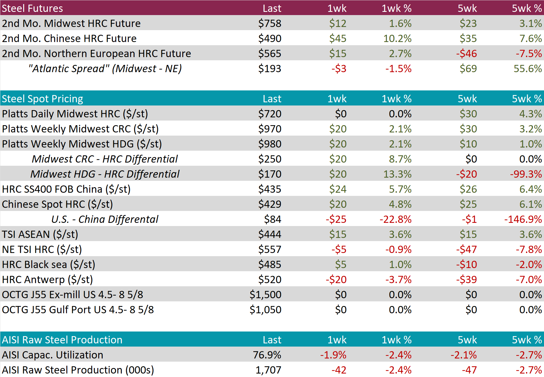• Domestic steel spot prices varied this week, with HRC holding steady, while tandem products rose. At the same time, the HRC 2nd month future increased to its highest price since May.