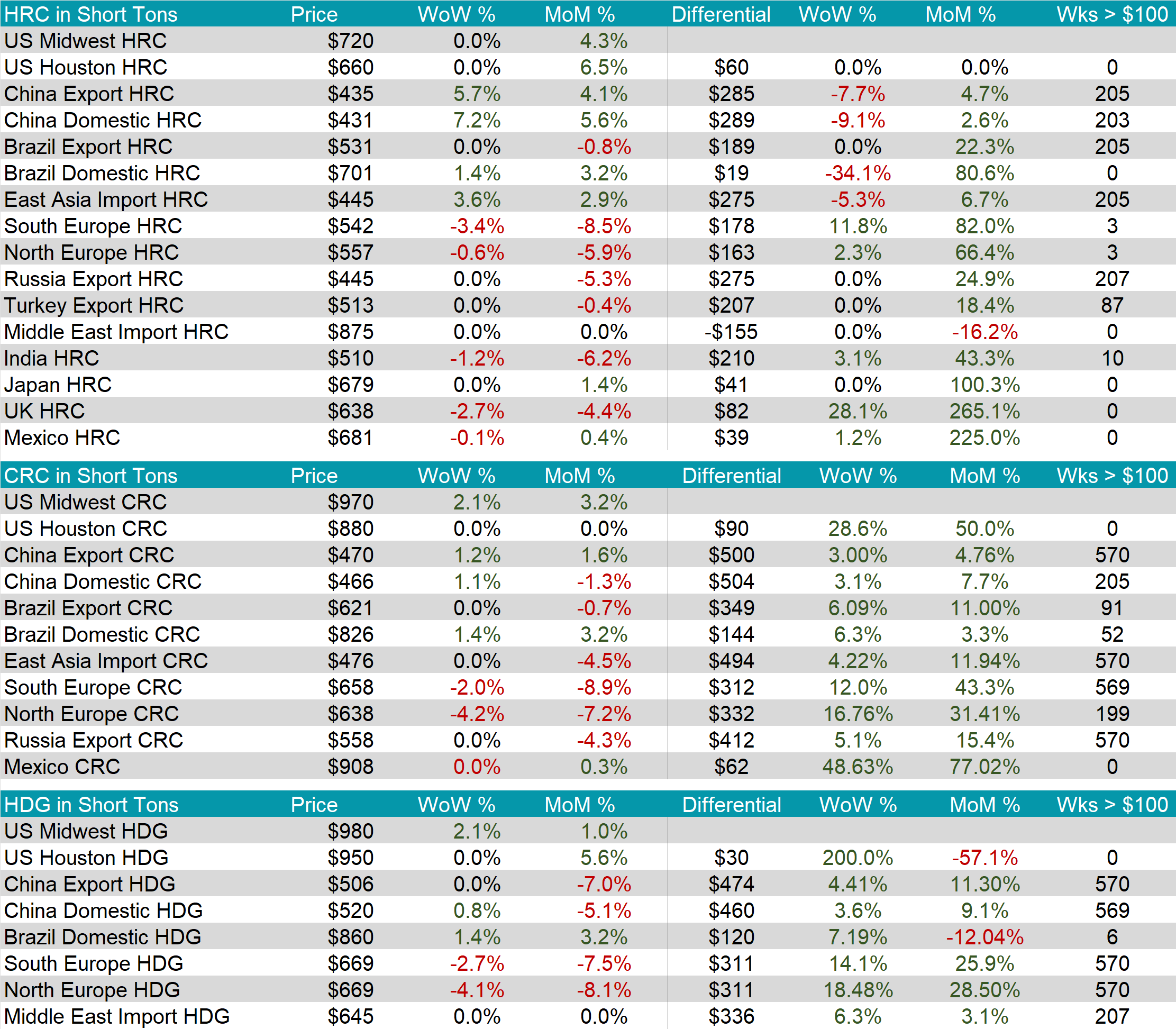 Tandem products both rose by $20, resulting in the HDG – HRC differential to widen by $20 or 13.3% to $170.