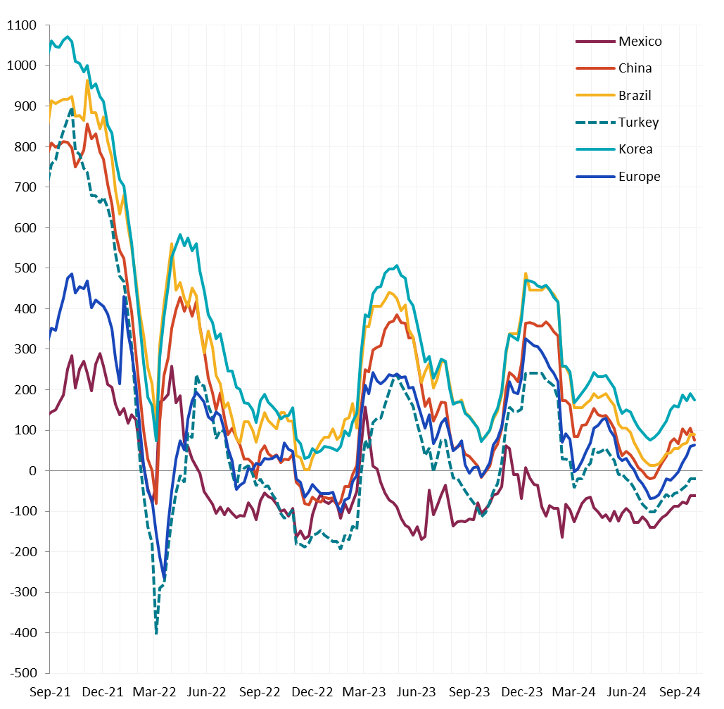 • Globally, steel prices were mixed, with China and Korea rising more than Europe fell, resulting in the overall Domestic – Global price differential to contract for the first time in eight weeks.