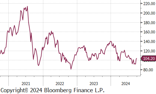 The iron ore 2nd month future jumped by $13.10 or 14.4% to $104, reaching the highest price in ten weeks.