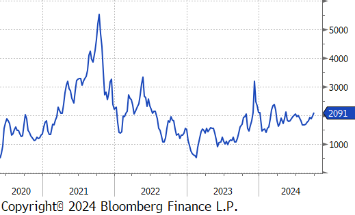 The Baltic Dry Index surged by $115 or 5.8% to $2,091, marking the fourth consecutive week of increases and hitting the highest level since March.