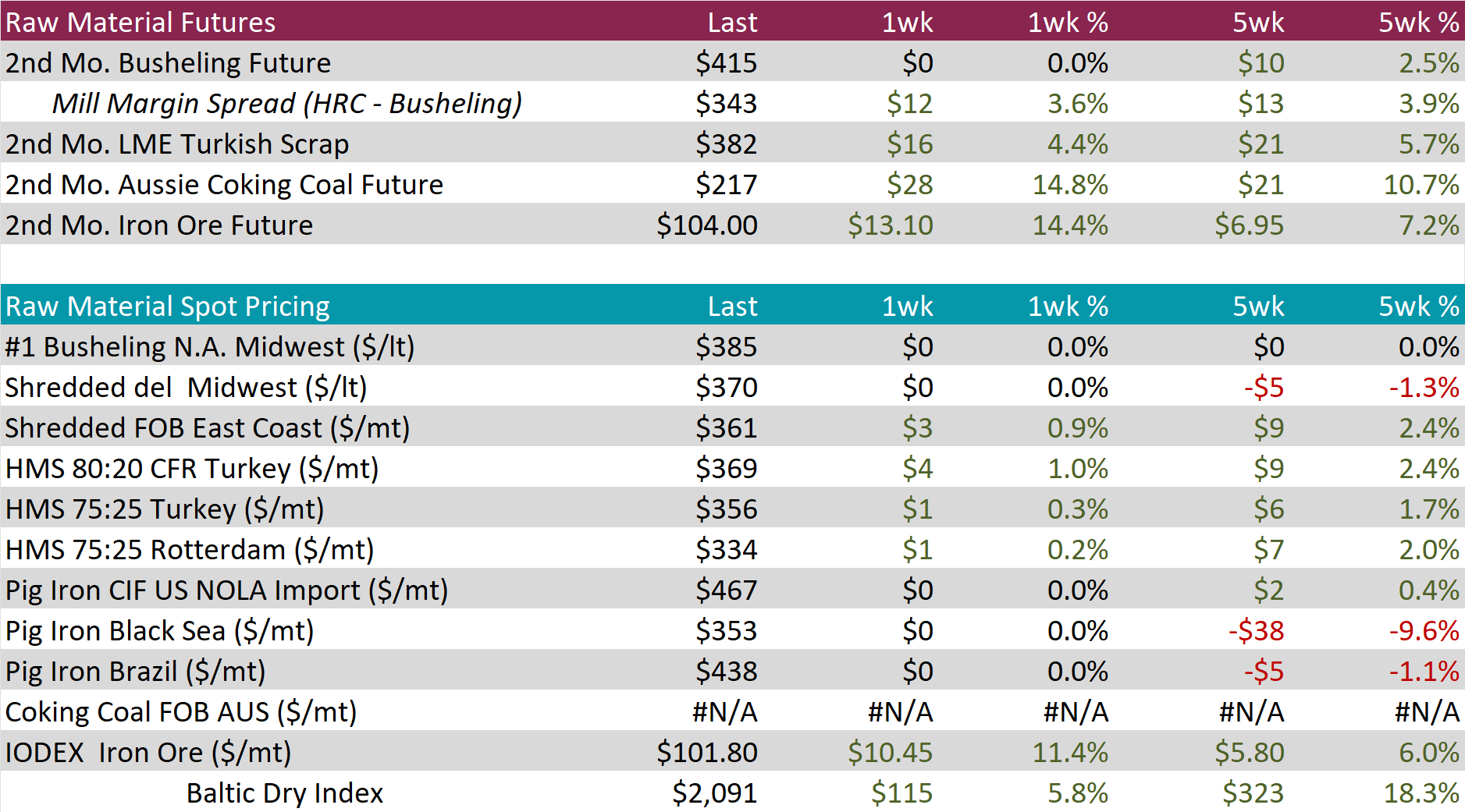 • Raw materials and their futures largely rose across the board, expect for busheling spot and 2nd month future, which remained unchanged.