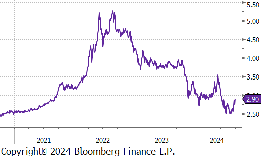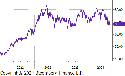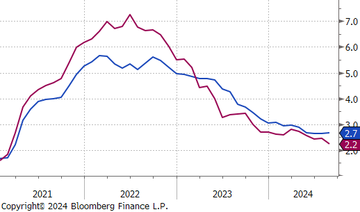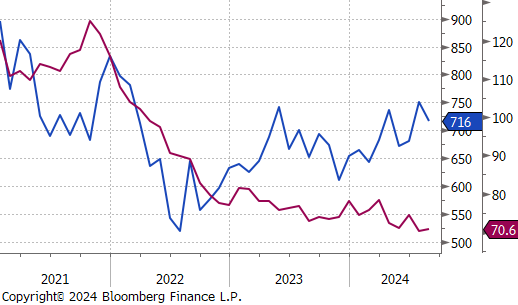 The best news of the week came from the continued disinflationary trend seen in PCE (Personal Consumption Expenditures); the FEDs preferred measure of inflation. Here we see both the Topline and Core measure coming in below expectations, (2.2% v 2.3%) and (2.7% v 2.7%), respectively. We anticipate both YoY measures to be sticky around current levels to end the year, due to 2H23’s significant disinflationary pressure, however, there is a real possibility that Core PCE could be back in the FEDs 2% target by the spring if the rapid cutting cycle does not lead to an overheated consumer. Encouragingly, the final September U. of Michigan Consumer Sentiment survey rose to 70.1, with consumer expectations of the 1yr inflation outlook sticky at 2.7% (the lowest level since December 2020).