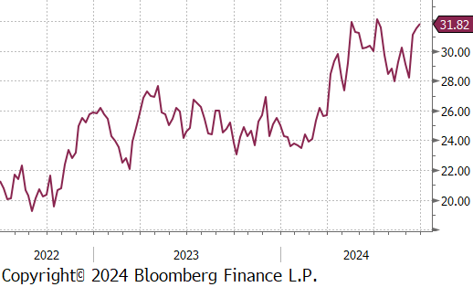 Silver rose by $0.31 or 1.0% to $31.82. Bullion assets have been buoyed by expectations of further rate cuts from the Federal Reserve and other central banks. Silver has also gained from recent fiscal and monetary stimulus announcements aimed at boosting China’s economy; the world’s second-largest. These developments, along with broader gains in industrial metals, have improved the outlook for silver-demanding sectors such as electrification technologies and solar panel manufacturing.