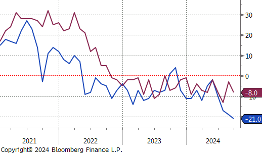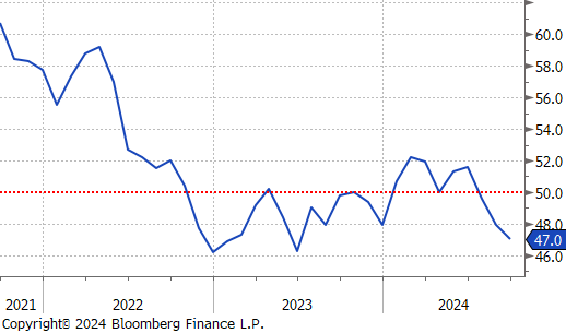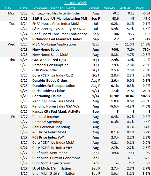 The preliminary September S&P Global Manufacturing PMI fell to 47, from 47.9 in August, and below the expectation of an increase to 48.5. This came along with worse than expected prints for this week’s Regional Fed Manufacturing Surveys. Richmond printed -21, down from -19 in August and below expectations of an improvement to -12. Kansas City also printed down to -8, from -3 and worse than the expected -5.