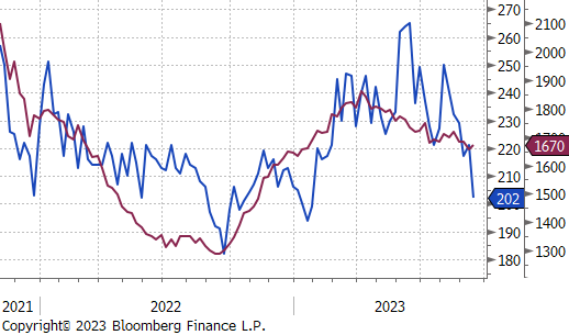 The 2nd month busheling future was down $15, or -3.3%, to $435. The mill margin spread increased again this week, albeit more significantly than the prior week, by $81 or 29%. This movement of divergence has most likely been caused by the heightened uncertainty around the UAW strikes.