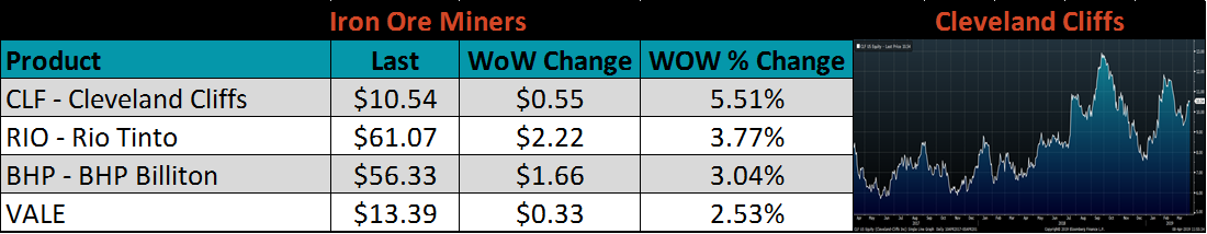 Raw material prices were mostly lower. The exception was iron ore prices, with the May future gaining 8.9% and the IODEX up 6.6%. This comes off the news of reduced production after a tropical storm moved through Western Australian. The future curve continues to push higher. Higher iron ore prices will lead to higher global steel prices if global demand conditions improve. The recovery in global PMIs is may indicate that producers will be able to pass this higher cost on to finished products.