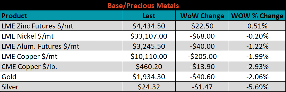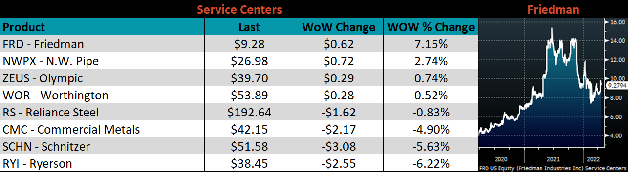 SBB Platt’s HRC, CRC and HDG pricing is below. The Midwest HRC, CRC, & HDG prices were down 2.7%, 1.1%, and 1%, respectively. Outside of the U.S., the Brazil domestic HRC price was up the most, 7.6%.