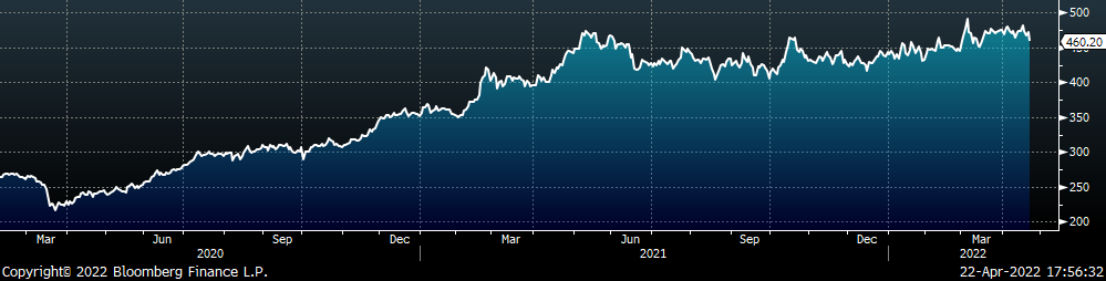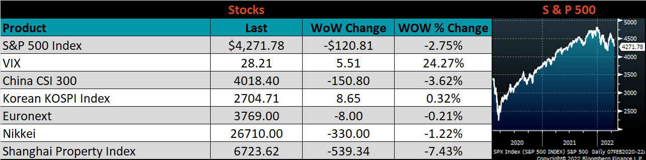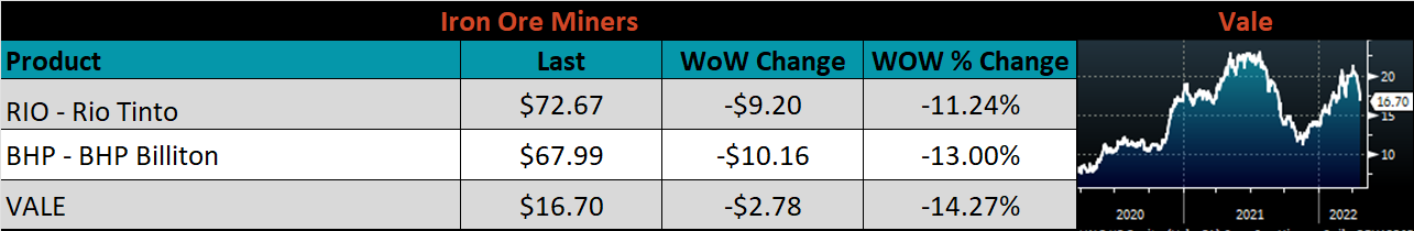Below are inventory levels for Chinese finished steel products and iron ore. Inventories drew down at each of the four watched categories. At this point of the year, inventories are at the higher end of the range, which could be in part due to the economic slowdown in China. Stocking Russian material?