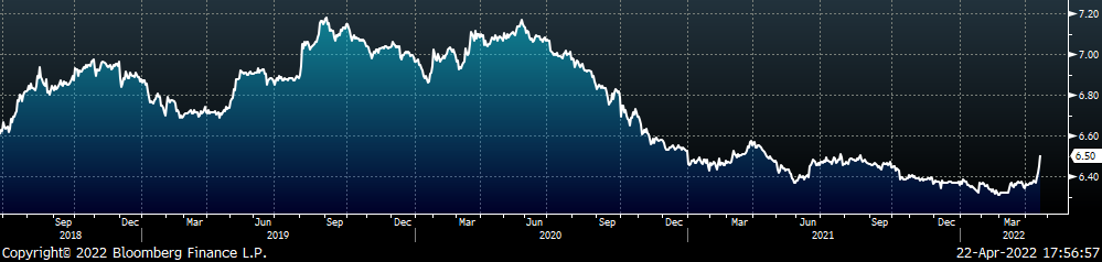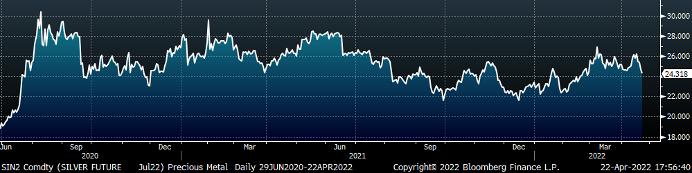 Below is the iron ore future curve with Friday’s settlements in orange, and the prior week’s settlements in green. Last week, the entire curve shifted lower at all expirations, most significantly in May 2022.