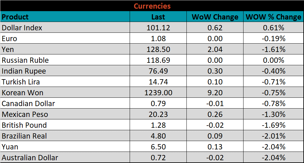 Below is the Midwest HRC price vs. each listed country’s export price using pricing from SBB Platts. We have adjusted each export price to include any tariff or transportation cost to get a comparable delivered price. Global differentials decreased across the board this week, as the U.S. price was down more significantly than the rest of the world.