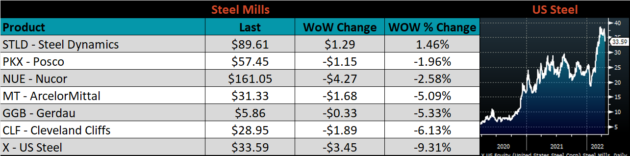 The CME Midwest HRC futures curve is below with last Friday’s settlements in white. The entire curve sold off again, for the 5th week in a row.