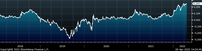 After a recent low level of sheet imports arrived in February, they appear to have rebounded with March and April projected at 1.2M, and 980k short tons, respectively. Intuitively, steady arrivals at these levels will keep domestic prices in check. However, expectations around lower prices because of increased imports need to be remain line with what the data is telling us. The chart below shows the relationship between the Midwest and Houston HRC prices, where the Houston price is used as a delivered import price.
