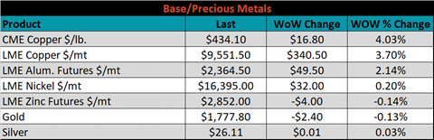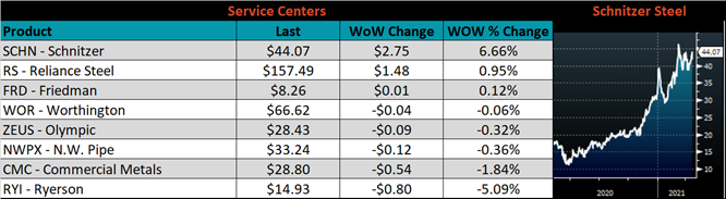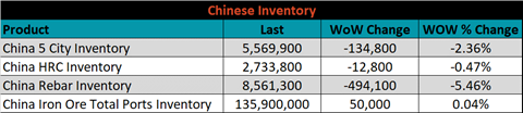 SBB Platt’s HRC, CRC and HDG pricing is below. The Midwest HRC, HDG & CRC prices were up, 2.9%, 4.5% and 0.9%, respectively. Globally, the Indian HRC price was up 6.8%.