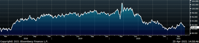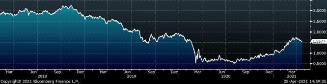 Last week, the June WTI crude oil future was down $0.99 or 1.6% to $62.14/bbl. The aggregate inventory level was down another 0.1%, while crude oil production remains at 11m bbl/day. The Baker Hughes North American rig count was down 2 rigs, and the U.S. rig count was down 1 rig.
