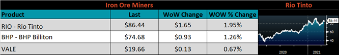 Below is the iron ore future curve with Friday’s settlements in orange, and the prior week’s settlements in green. Last week the curve shifted higher at all expirations, for the 3rd week in a row.