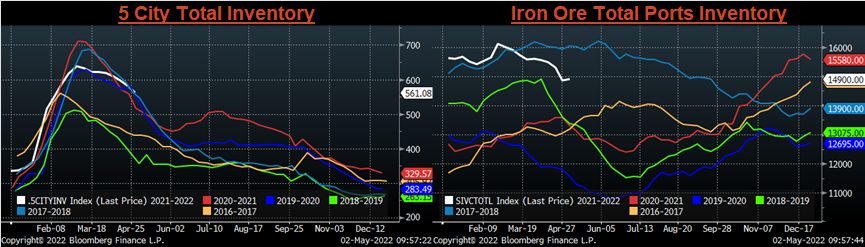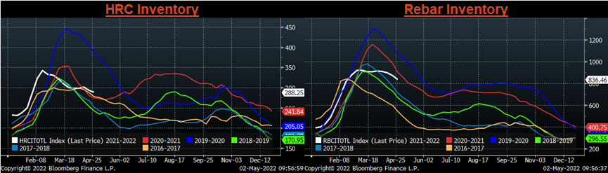 What is most interesting about this chart is the fact that while prices were constantly reaching new record highs in the spot market, the spread between HDG and HRC did not set a record until the end of June, when HRC was $1,750. A few months later, once steel prices were falling, we entered a period where HRC prices fell far more severely than HDG or CRC and that spread expanded to historic levels. From the previous peak in September to today, the real cost to convert HRC into a tandem product has not meaningfully increased. Therefore, we interpret the historically elevated spread over the last 7 months as an indication of stable demand in value-added products, throughout the downside move. The major difference between then and now is that inventories from steel consumers are lower than they were in the beginning of this year when the spread was its widest. Today, buyers appear to be on the sidelines as spot prices drift lower, however, the market should be cautious of assuming prices will continue to fall for a prolonged period when there does not appear to be enough material on hand for a full-on buyer’s strike.