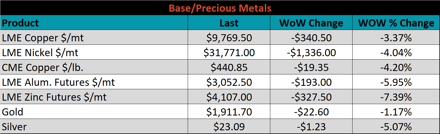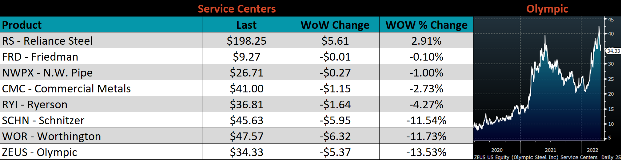 SBB Platt’s HRC, CRC and HDG pricing is below. The Midwest HRC was down 1.4%, while CRC, & HDG prices were both unchanged. Outside of the U.S., the UK HRC price was down the most, -11.1%.