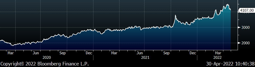Moving on to the second question, the dramatic pace of the 50% rebound from March to April was driven by input cost concerns, and those have not been entirely resolved. The chart below is an updated look since it was published in the March 18th report, with the front month Busheling Future (white), Pig Iron delivered to New Orleans (blue), and Midwest shredded scrap (green).