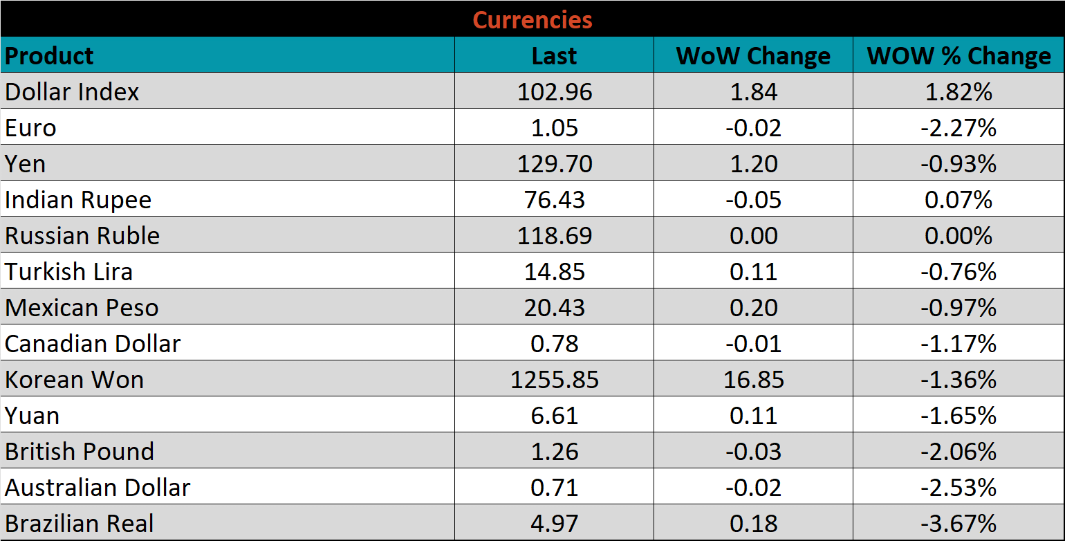 The CME Midwest HRC futures curve is below with last Friday’s settlements in white. The entire curve sold off again, for the 6th week in a row, most significantly in the later expirations.
