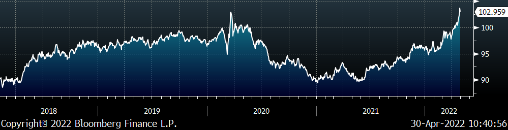 Last week, the June WTI crude oil future gained $2.62 or 2.6% to $104.69/bbl. The aggregate inventory level was down 0.3% and crude oil production remains at 11.9m bbl/day. The Baker Hughes North American rig count was down another 3 rigs, while the U.S. rig count was up another 3.