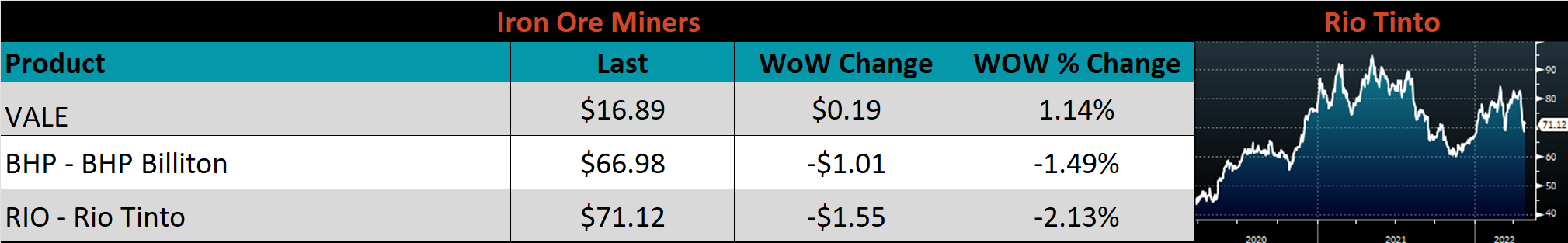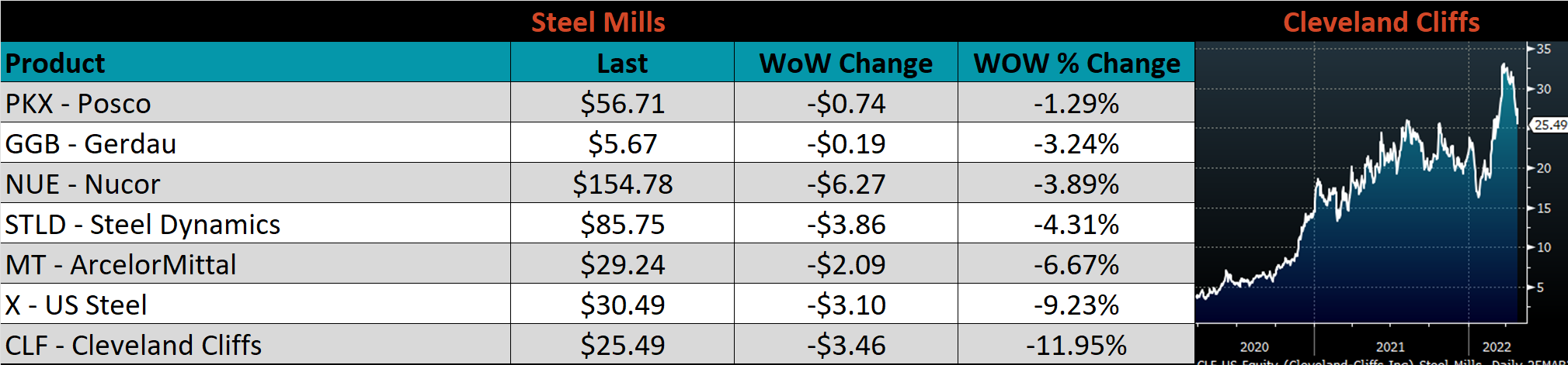 Raw material prices were mostly lower, East Coast shredded, down 12.5%, while Aussie coking coal was up 15.4%.