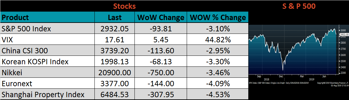 The U.S. 10-year yield was down 23 bps, closing the week at 1.85%. The German 10-year yield was down another 12 bps to minus 0.5% and the Japanese 10-year yield was down 2 bps to minus 0.16%. Yields across the globe plummeted last week, possibly signaling slower economic growth.