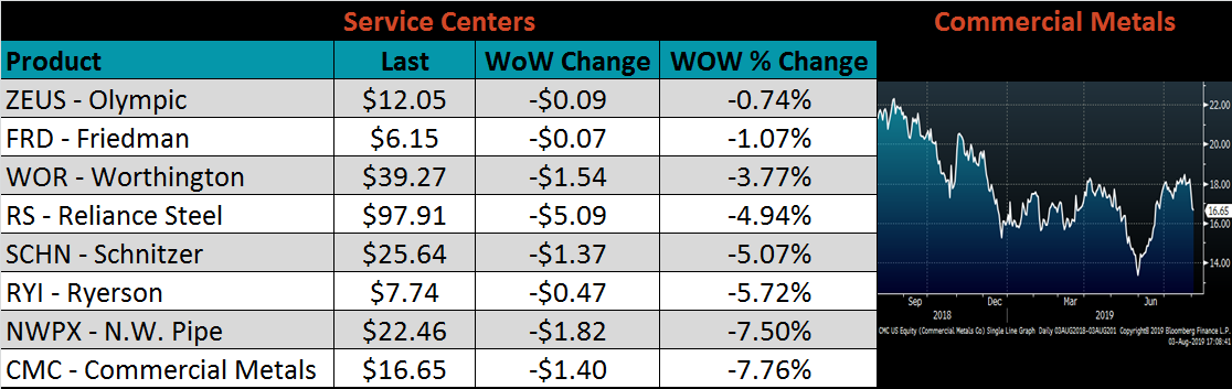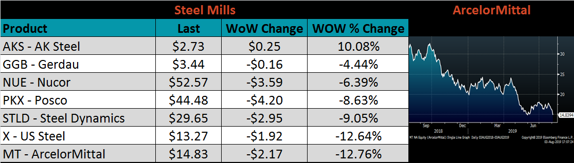 Raw material prices were mostly lower. Midwest delivered shredded was the exception, up 7%, while ore futures and the IODEX were down 10.6% and 8.7%, respectively.