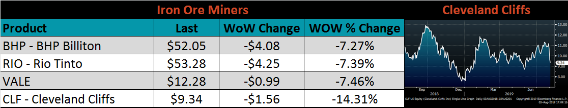 September ferrous futures were mostly lower. Iron ore lost 10.6%, while Midwest HRC gained 1.8%.