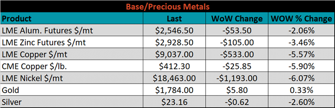 SBB Platt’s HRC, CRC and HDG pricing is below. The Midwest HRC, CRC, & HDG prices were each up by 0.4%, respectively. Globally, the Mexican domestic CRC price was down 3.8%.