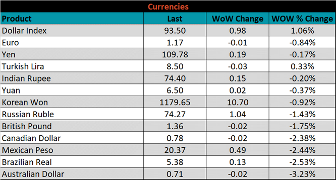 Below is the Midwest HRC price vs. each listed country’s export price using pricing from SBB Platts. We have adjusted each export price to include any tariff or transportation cost to get a comparable delivered price. Differentials for all watched countries increased further this week, as the U.S. price continues grinding higher.
