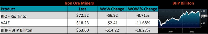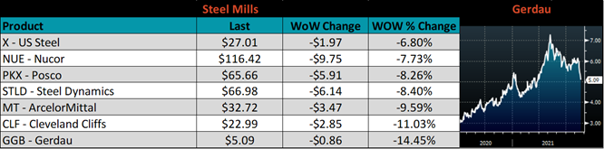 Raw material prices were mostly lower, led by the IODEX iron ore index, down another 13.5%, while Aussie coking coal was up another 3%.