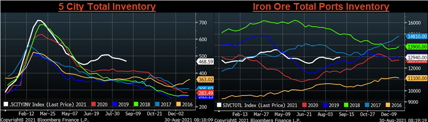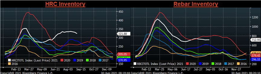 Below are inventory levels for Chinese finished steel products and iron ore. HRC and the 5-city inventory levels continued to decline, while rebar and iron ore moved slightly higher.