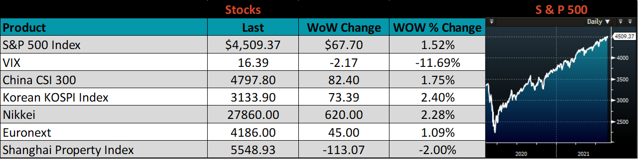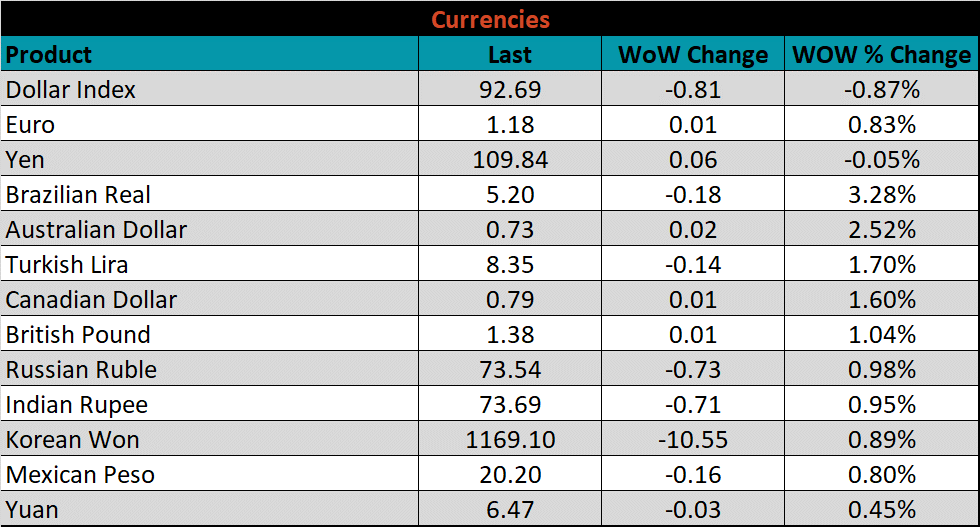 The U.S. 10-year yield was up 5 bps, closing the week at 1.31%. The German 10-year yield was up 7 bps to minus 0.42%, and the Japanese 10-year yield was up 2 bps to 0.03%.