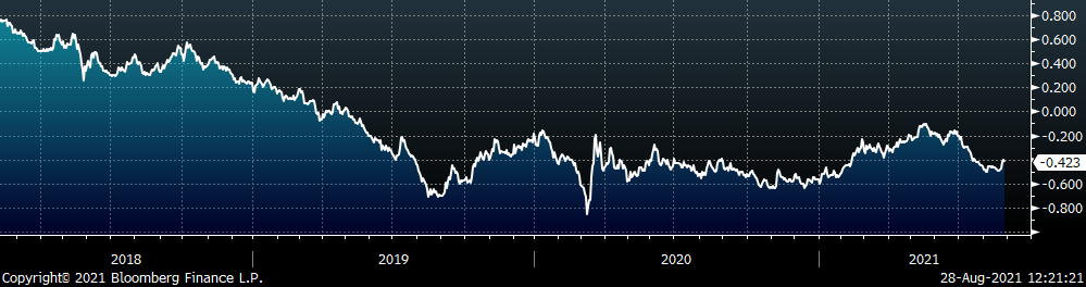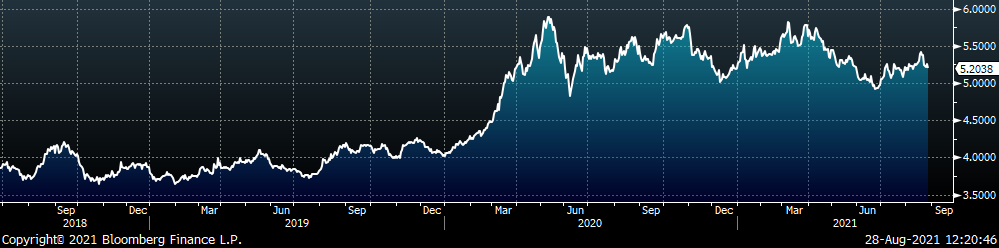 Last week, the October WTI crude oil future was up $6.60 or 10.6% to $68.74/bbl. The aggregate inventory level was down another 0.6%, and crude oil production was unchanged at 11.4m bbl/day. The Baker Hughes North American rig count was down another 4 rigs, while the U.S. rig count was up 5 rigs.