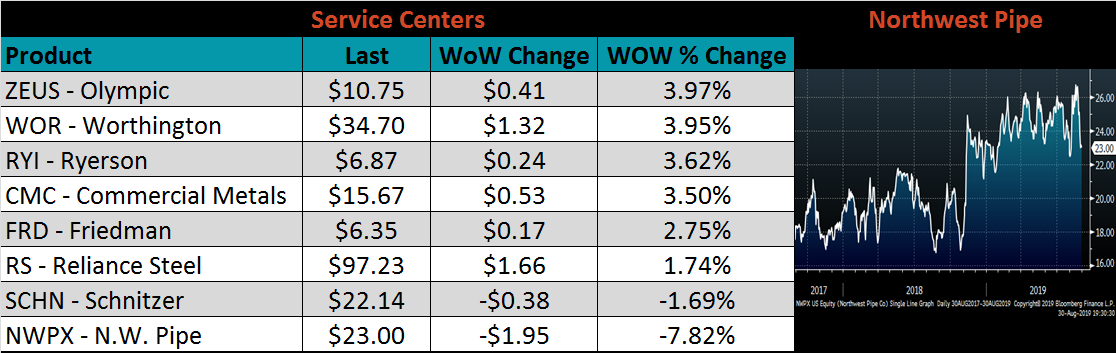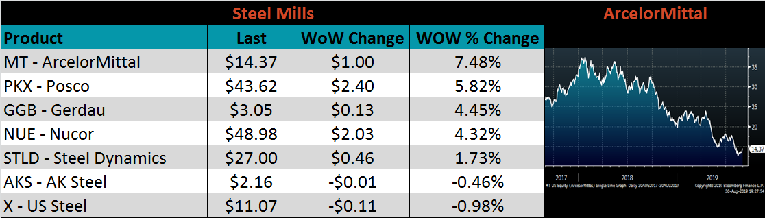 However, the hard data, i.e. data pertaining to supply and demand, paints a much different picture. Imports remain at low levels and current price differentials will discourage further imports this year. While future prices have declined recently, lead times remain strong, indicating mills have filled their order books. BOF and EAF profitability has remained steady over the last few weeks as raw material prices have declined simultaneously. The below chart shows HRC prices relative to scrap pricing, which explains why mills were able to negotiate lower prices while maintaining profitable sales.