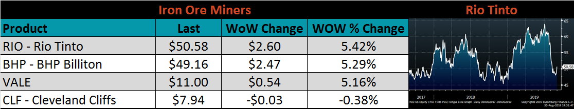 Below are inventory levels for Chinese finished steel products and iron ore. Overall trends have continued, HRC, Rebar and 5-City inventory levels were lower, while Iron Ore port inventory continues to increase. Destocking in finished goods is likely due to diminished domestic and global demand.