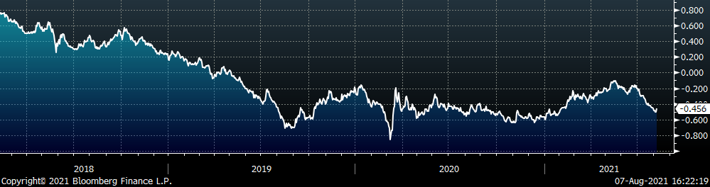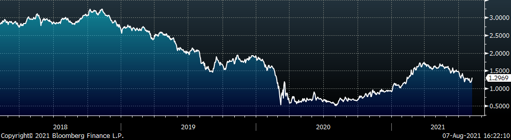 The CME Midwest HRC futures curve is below with last Friday’s settlements in white. Last week, the front of the curve showed very little change, while 4Q21-1Q22 shifted lower. The chart below shows how tight of a price range futures have been trading in over the last month.