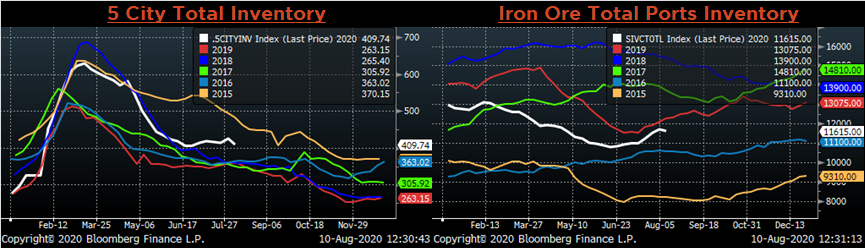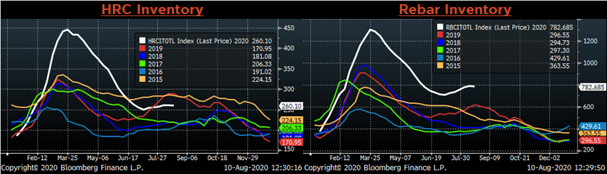 Below are inventory levels for Chinese finished steel products and iron ore. All of the inventory levels moved lower, ending a short trend of increasing inventory levels.