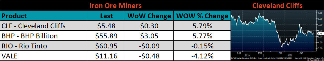 Raw material prices were mostly higher, led by the IODEX and iron ore futures, up 6.6% and 6.3%, respectively, while Midwest busheling was down 7%.