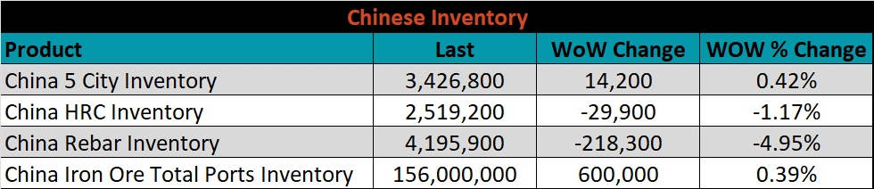 Below is the Midwest HRC price vs. each listed country’s export price using pricing from SBB Platts. We have adjusted each export price to include any tariff or transportation cost to get a comparable delivered price. All the watched countries differentials decreased this week, as the U.S. price fell further than their respective prices.