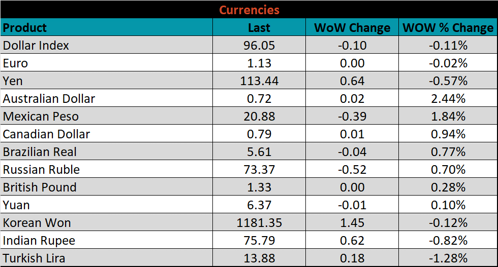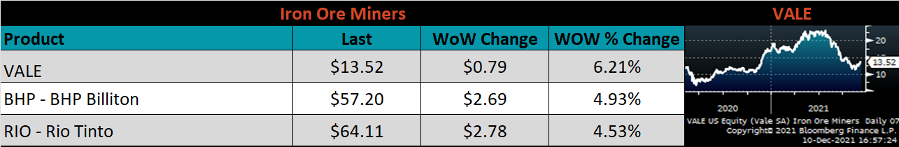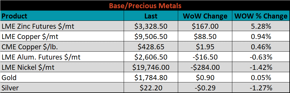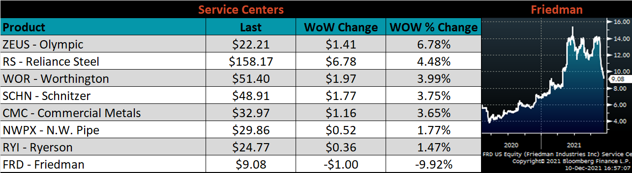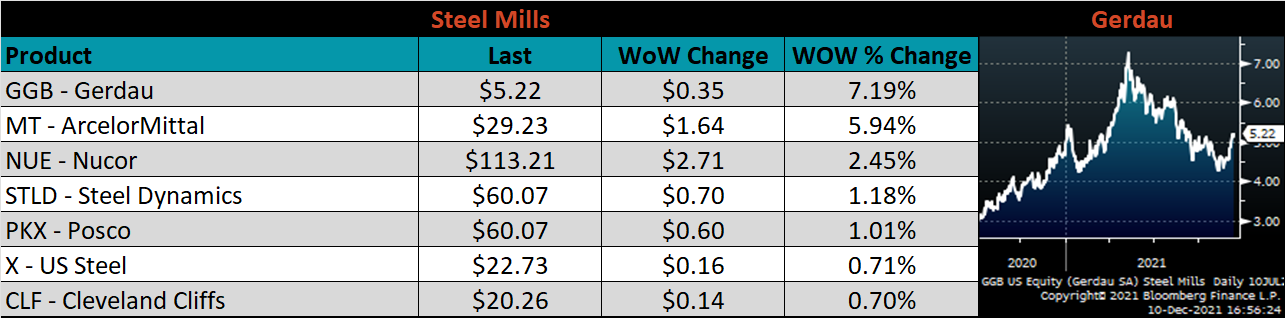 The CME Midwest HRC futures curve is below with last Friday’s settlements in white. Last week, the curve was mixed but mostly unchanged, with a few expirations settling significantly higher (Apr.22 & Aug.22).