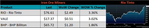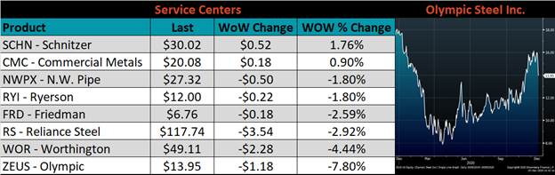 SBB Platt’s HRC, CRC and HDG pricing is below. The Midwest HRC, CRC and HDG prices were up 5.6%, 5.5% and 4%, respectively. Globally, the Southern and Northern European CRC prices were up 8.6% and 7.5%, respectively.