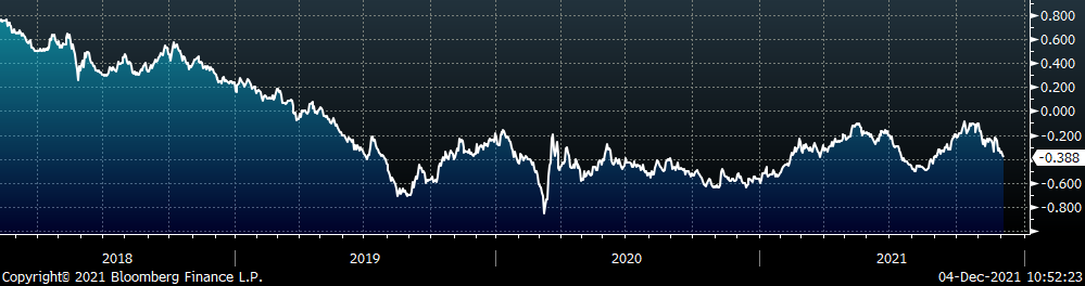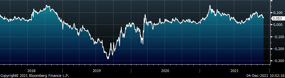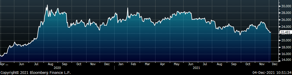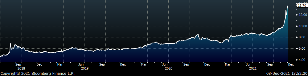 November U.S. light vehicle sales ticked slightly lower, to a 12.9m seasonally adjusted annualized rate (S.A.A.R). The second chart shows the relationship between the unemployment rate and auto sales. The unemployment rate is inverted to show that declining unemployment typically leads to increasing auto sales. The labor market recovery continued improved, albeit below expectations in November, and continues to show significant existing pent-up demand for cars, once the chip shortage is resolved.