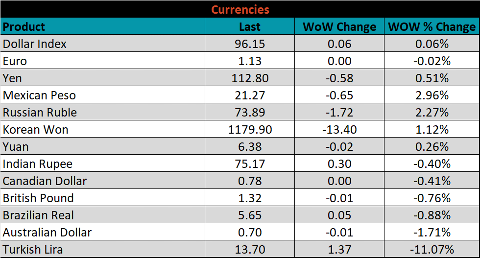Below is the Midwest HRC price vs. each listed country’s export price using pricing from SBB Platts. We have adjusted each export price to include any tariff or transportation cost to get a comparable delivered price. The Turkish and Brazilian differentials increased this week, with their prices falling further than the U.S. domestic price. The remaining countries (Korea, China & Russia) all saw their price differentials decline.