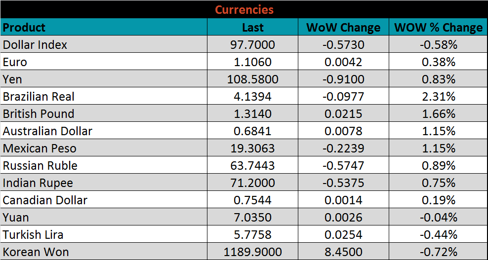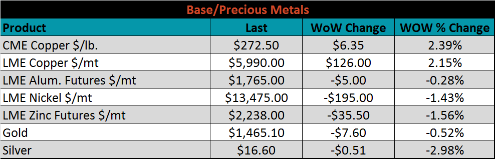 SBB Platt’s HRC, CRC and HDG pricing is below. The Midwest HDG, HRC and CRC prices were all up significantly, 4.3%, 3.9% and 3.1% higher, respectively. Globally, the Brazilian HRC and Chinese HDG export prices were up, 6.6% and 6.1%, respectively.