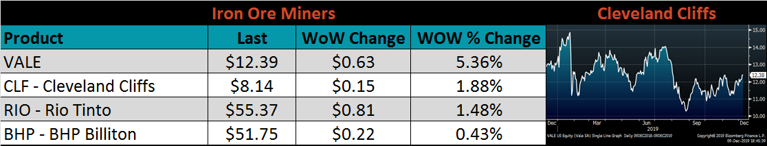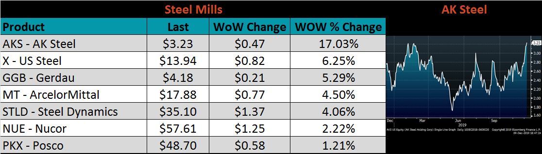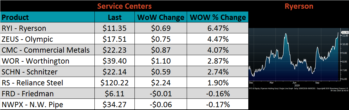 Raw material prices were mostly higher. Midwest shredded was up 15.6% while Midwest busheling #1 was up 13.5%.