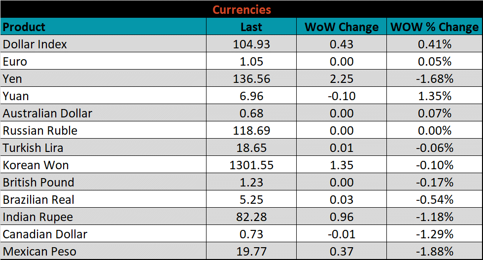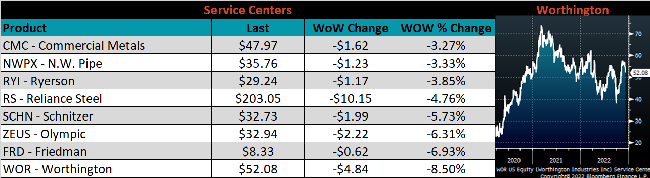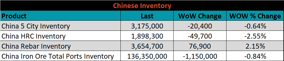 Below is the Midwest HRC price vs. each listed country’s export price using pricing from SBB Platts. We have adjusted each export price to include any tariff or transportation cost to get a comparable delivered price. The differentials for Turkey and Brazil increased this week, while the remaining countries saw their prices rise more significantly than U.S domestic prices.
